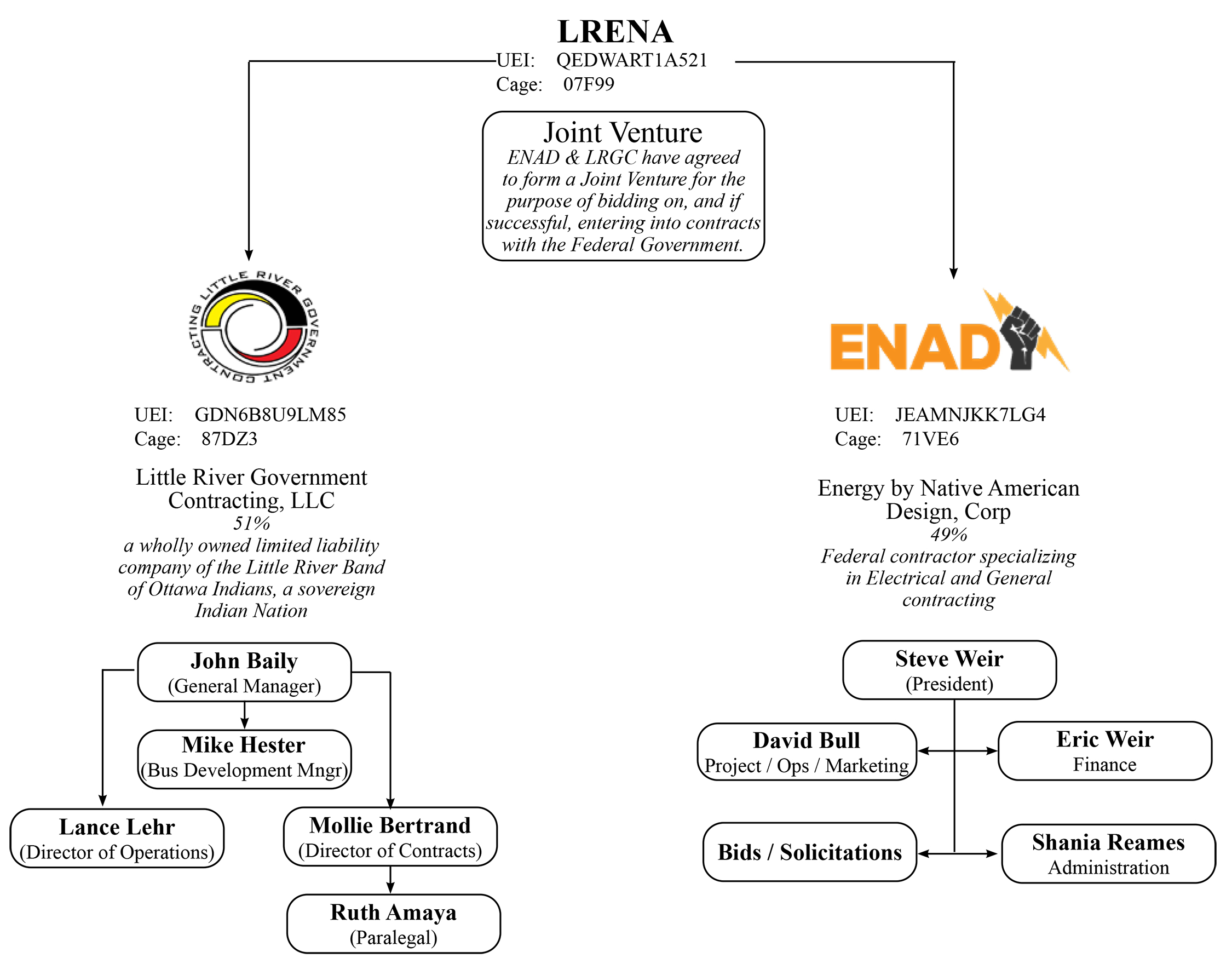 Little River Government Contracting, LLC ("LRGC") is a wholly owned limited liability company of the Little River Band of Ottawa Indians ("LRBOI") a sovereign Indian Nation. ENAD is a company with a proven track record and expertise in electrical and general contrating services.